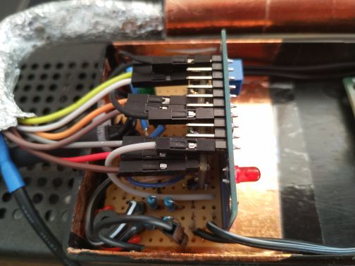 Please note that the normal RTS signal is 5V or higher and negative (inverted), but the GPIO-out signal is 3.3V only and is positive. My home built data box can handle both signals using an opto coupler and an internal inverter.The system worked fine on 20m, but on 10m band the system showed strange effects until the cover of the RPi was shielded. I used grounded copper tape as for the box.