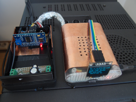 The AD9850 DDS module needs 5V, ~130 mA. To power the module from the transceiver the 14.4V line must be used. To get the 5V a standard voltage regulator module is used (LM7805 + 2 capacitors). This results in a heat problem because the voltage regulator produces (14.4-5)V * 0,13A ~= 1.2W as heat. The standard cooling shield of the module was replaced by a larger shield of a DRAM module. Additionally 54 holes were drilled in the small box for better cooling.