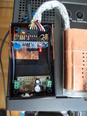 Copper tape connected to ground is used on the inner side of the small box to shield the VFO.